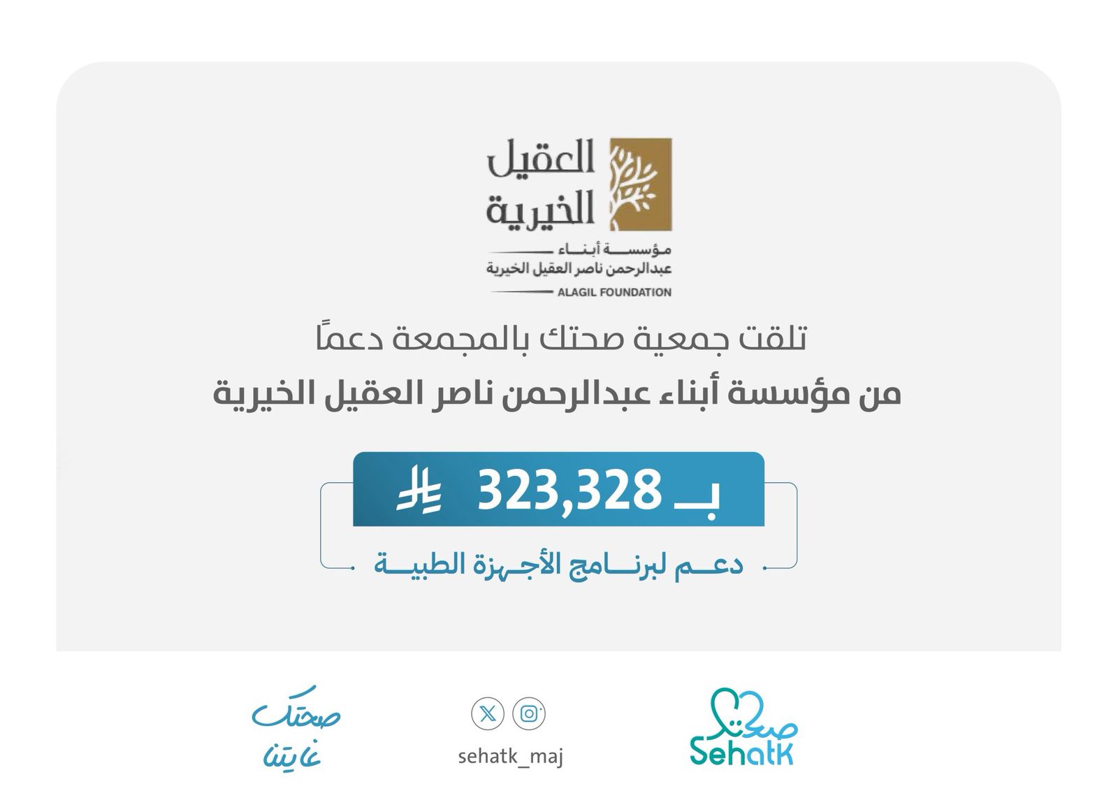 تتقدم #جمعية_صحتك بالمجمعة بخالص الشكر والتقدير لمؤسسة أبناء عبدالرحمن ناصر العقيل الخيرية على تبرعهم الكريم بمبلغ (323,328) ريال دعمًا لبرنامج الأجهزة الطبية . سائلين الله أن يجعل ما قدموه في ميزان حسناتهم 🌿